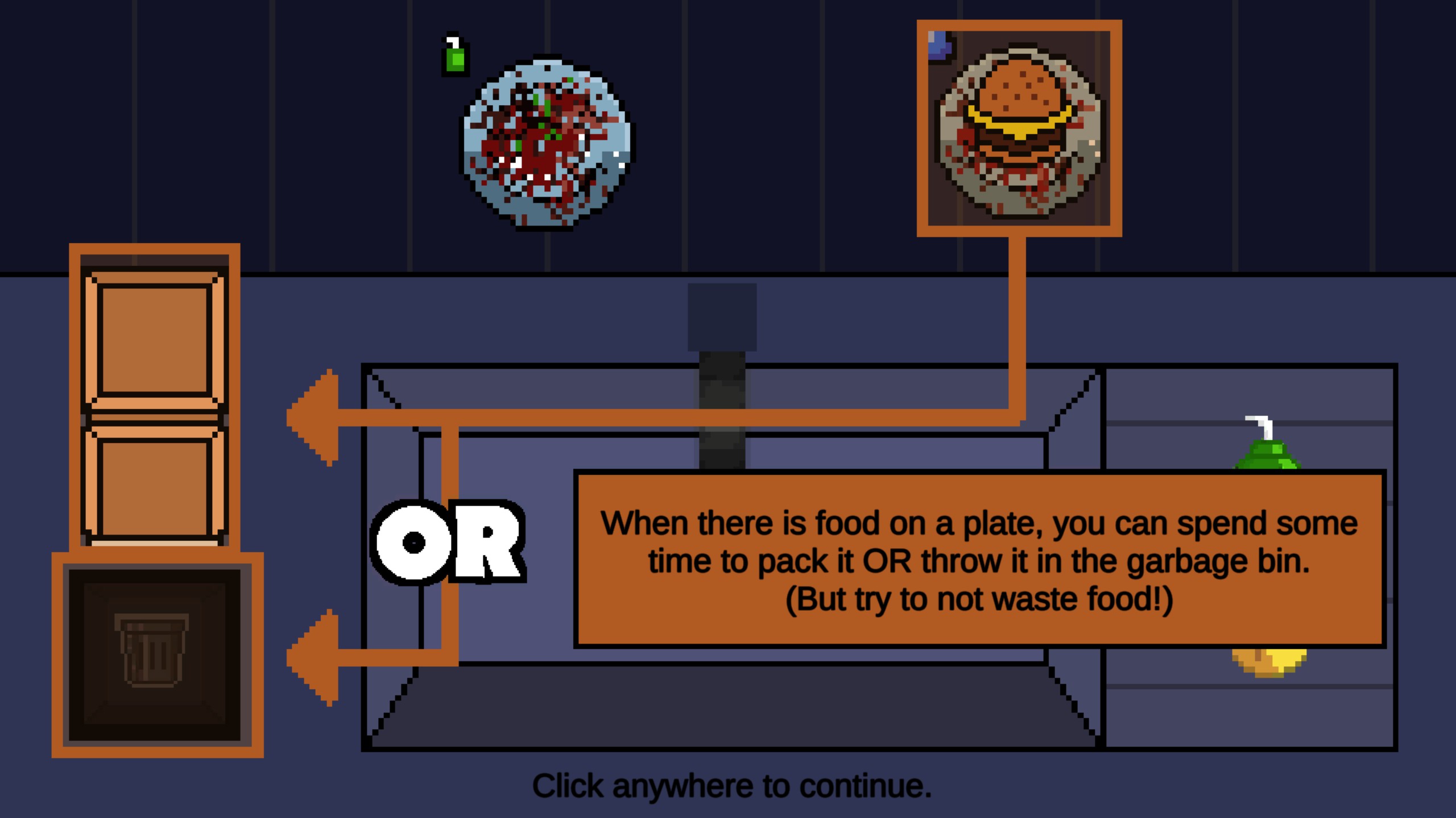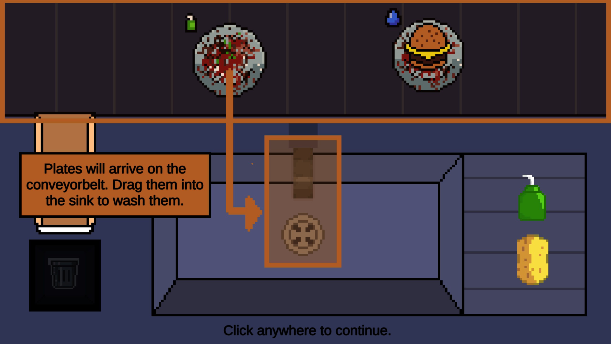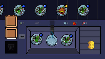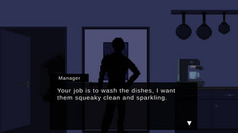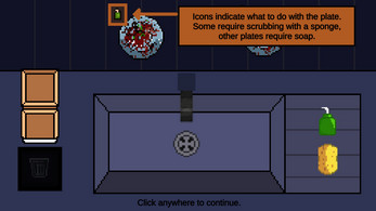 Washed Out is a 2D Washing Simulator with a fun Cleaning Gameplay Loop. After each day of washing plates the player can decide how to handle food waste and impact the local community. At the end of the game the choices made lead to different endings.